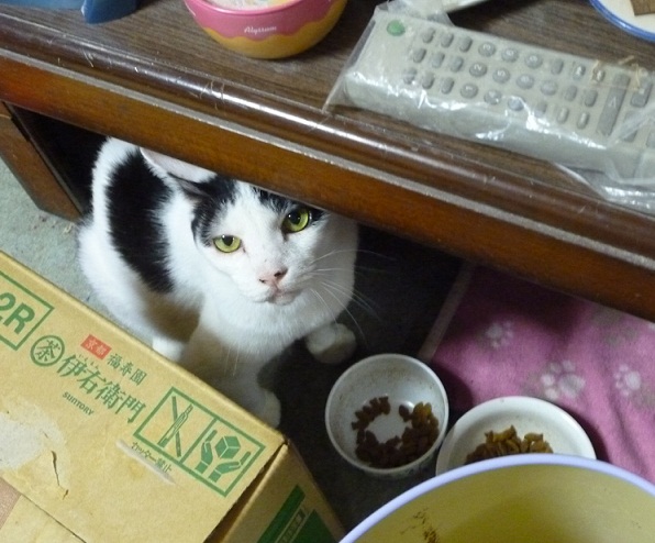べスの机・・・大昔の応接セットの細長い机なのだけど(愛犬のべスが足元を齧った)それを和室に置いて、上にはミニコンポやらが乗っているのだけど、その下にアカネはいつも居る。