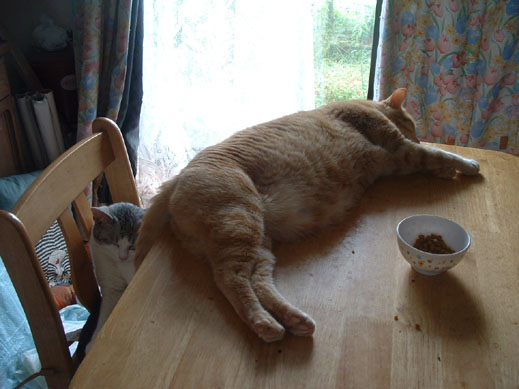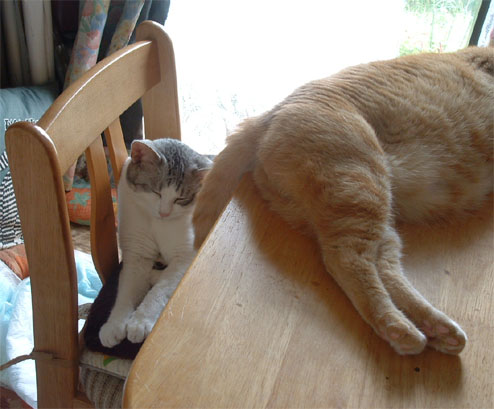 昼間、椅子で寝るカイにアトムのシッポが邪魔をしていた。