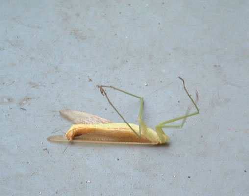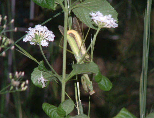 ランタナに居るカマキリを確認したら、交尾中だったけど...上に乗ってるオスが変だ。