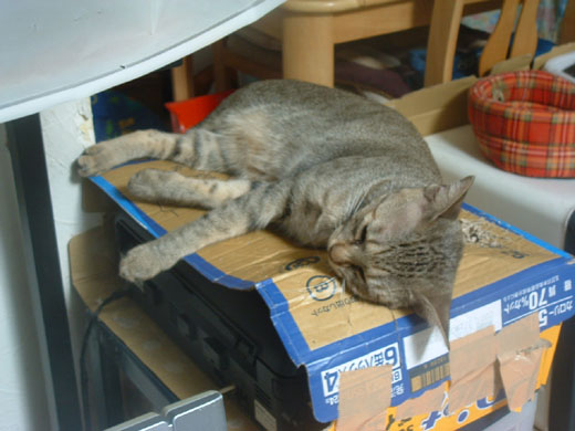 箱に入れた電話機の上でネンネ、のサヤ。