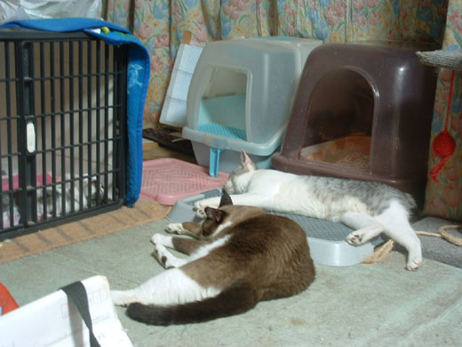 ヤマトのケージの前には、よくチビ、セイラ、カイ、サヤが寄って行っている。