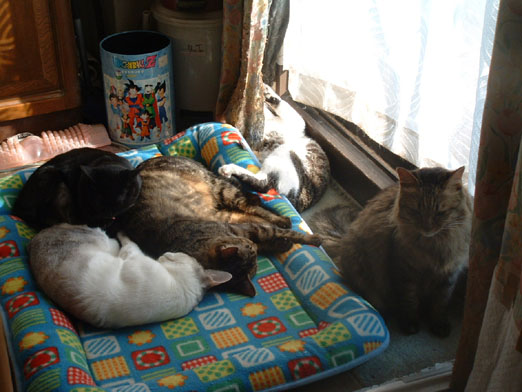 ぽっかぽかだね~~~ネコ達、窓辺に集まって気持ち良さ気にしているわ。