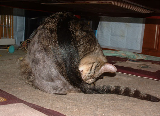 パイプハンガーに掛けたあった私の衣類が下に落ちていて、その上でアトムが寝ていた。