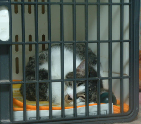 掃除しようと思っても、エアコンの下には2段ケージがあり、そこはネコ達のお気に入りなので、大概誰かが寝ているのだ(汗)