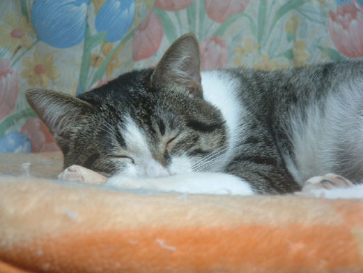 私が寝ていたら、一緒に際限なく寝ているけど...ちゃんとカリカリは減っているから途中で起きて食べたりしているんだろう。