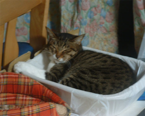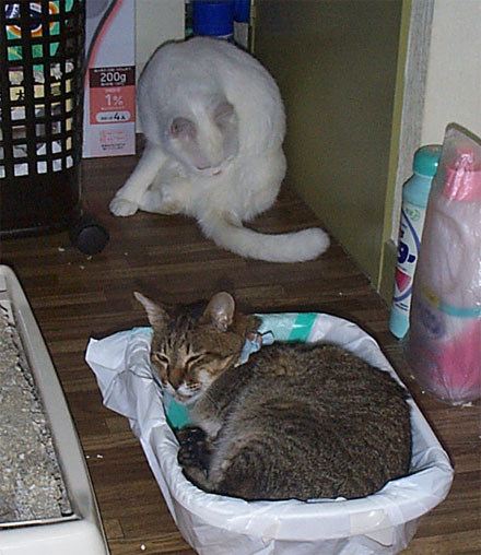 で、撤収したトイレを袋に入れてケージの上に置いていたら、其処が何故かネコ達のお気に入りに...