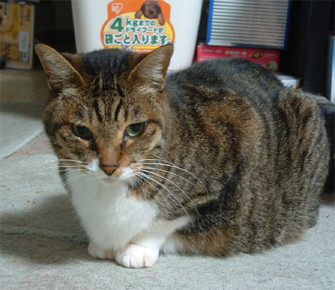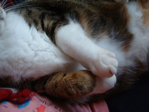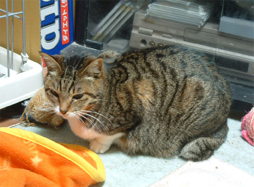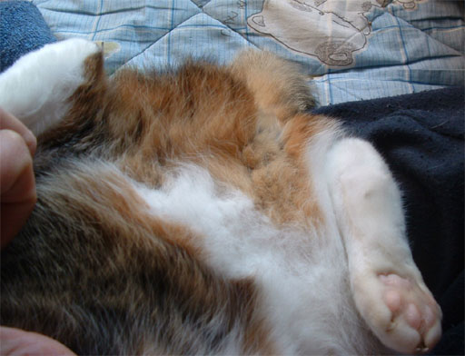 お腹の下の部分は茶色だから、一応「三毛」なんである(笑)