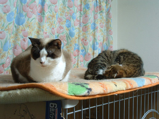 遊び疲れたカイくんがウトウト..チビが側に居たのでカメラを向けたら、チビが近づいて来た。