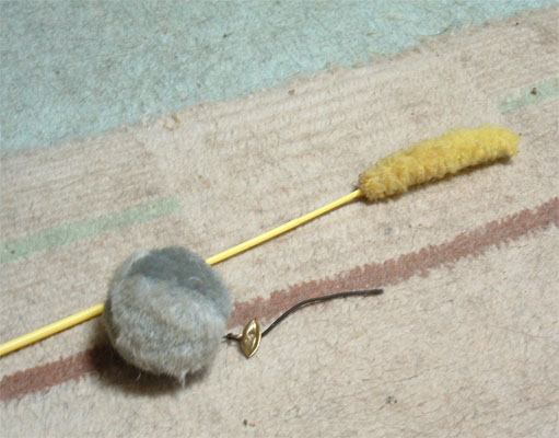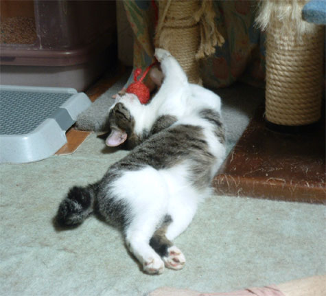答えは、ネズミの形のオモチャ...だったけど、チビのお気に入りはネコじゃらしと、このグレーの丸いオモチャだった、でも、このグレーのオモチャがネズミに見えたのかも??