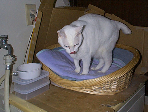 それまでは、好きに過ごしていたのに冷蔵庫の上から降りて来なくなって...トイレとかも心配だったので、洗面所を隔離スペースにしたのだった。