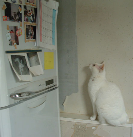 歳を取ったせいか、最近あまり高いジャンプをしないせいか、冷蔵庫を見上げるだけで上がろうとはしなかったけど。