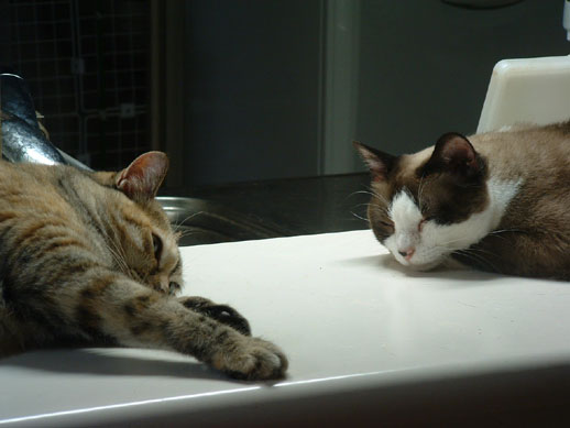 キッチンカウンターの上でウランとセイラが寝ていた。